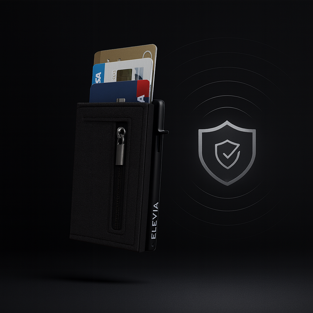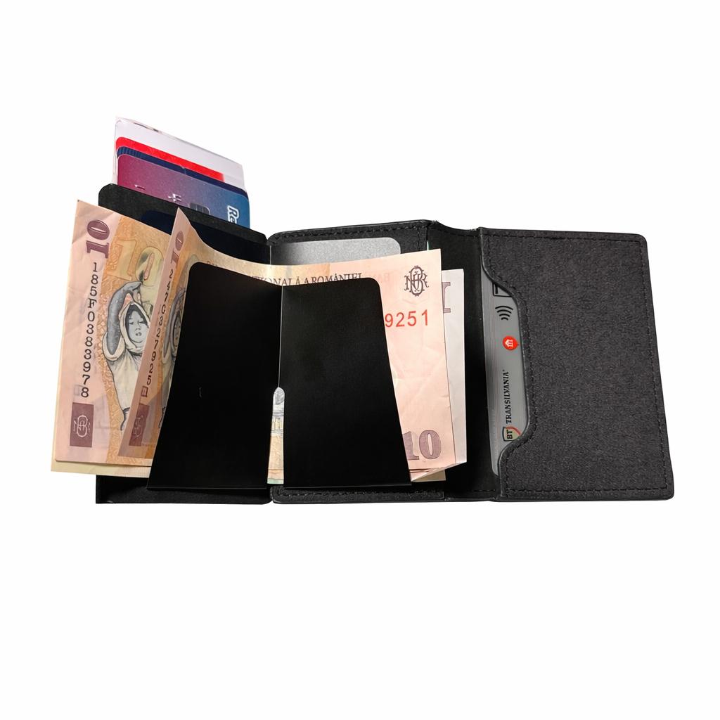 Compartimentul de metal din interior blochează semnalele RFID și NFC, protejând până la 7 carduri împotriva furtului de date.